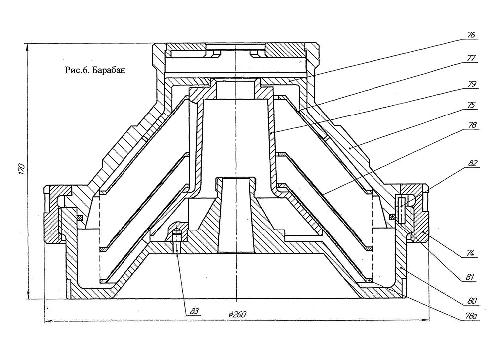 74 Гайка ОМ-1 01.613, 75 Крышка ОМ-1 40.070, 76 Тарелка прижимная ОМ-1 01.022, 77 Тарелка верхняя Ж5-Плава-ОСК-1 02.030, 78 Тарелка промежуточная Ж5-Плава-ОСК-1 02.020, 78а Тарелка нижняя Ж5-Плава-ОСК-1 02.010, 79 Тарелкодержатель ОМ-1 01.023, 80 Основание ОМ-1 01.050, 81 Кольцо ОМ-1 40.024, 82 Штифт А1-МСЛ 03.011-12, 83 Штифт ОМ-1 01.615